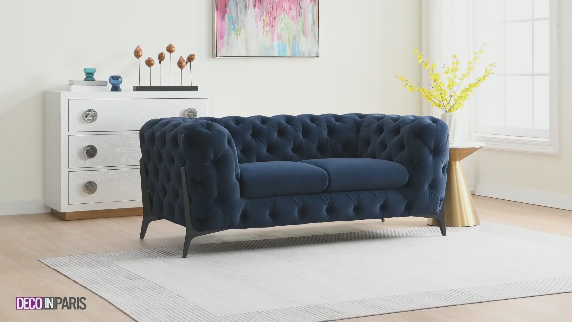 Le canapé 2 places capitonné chesterfield en velours bleu CARMEN apportera un superbe cachet à votre salon avec son allure cosy et élégante.