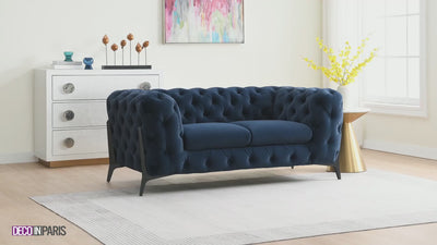 Découvrez l’alliage parfait du style mythique et indémodable du chersterfield avec la modernité du métal noir du canapé 2 places capitonnés en velours CARMEN.