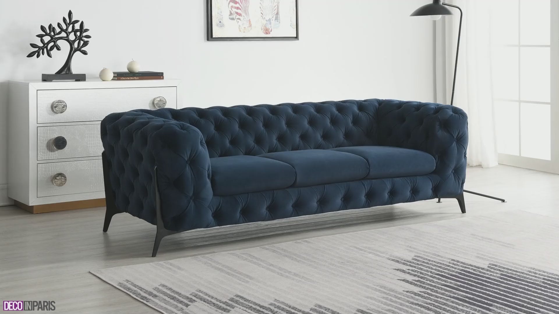 Le canapé 3 places chesterfield en velours bleu CARMEN apportera un superbe cachet à votre salon avec son allure cosy et élégante.