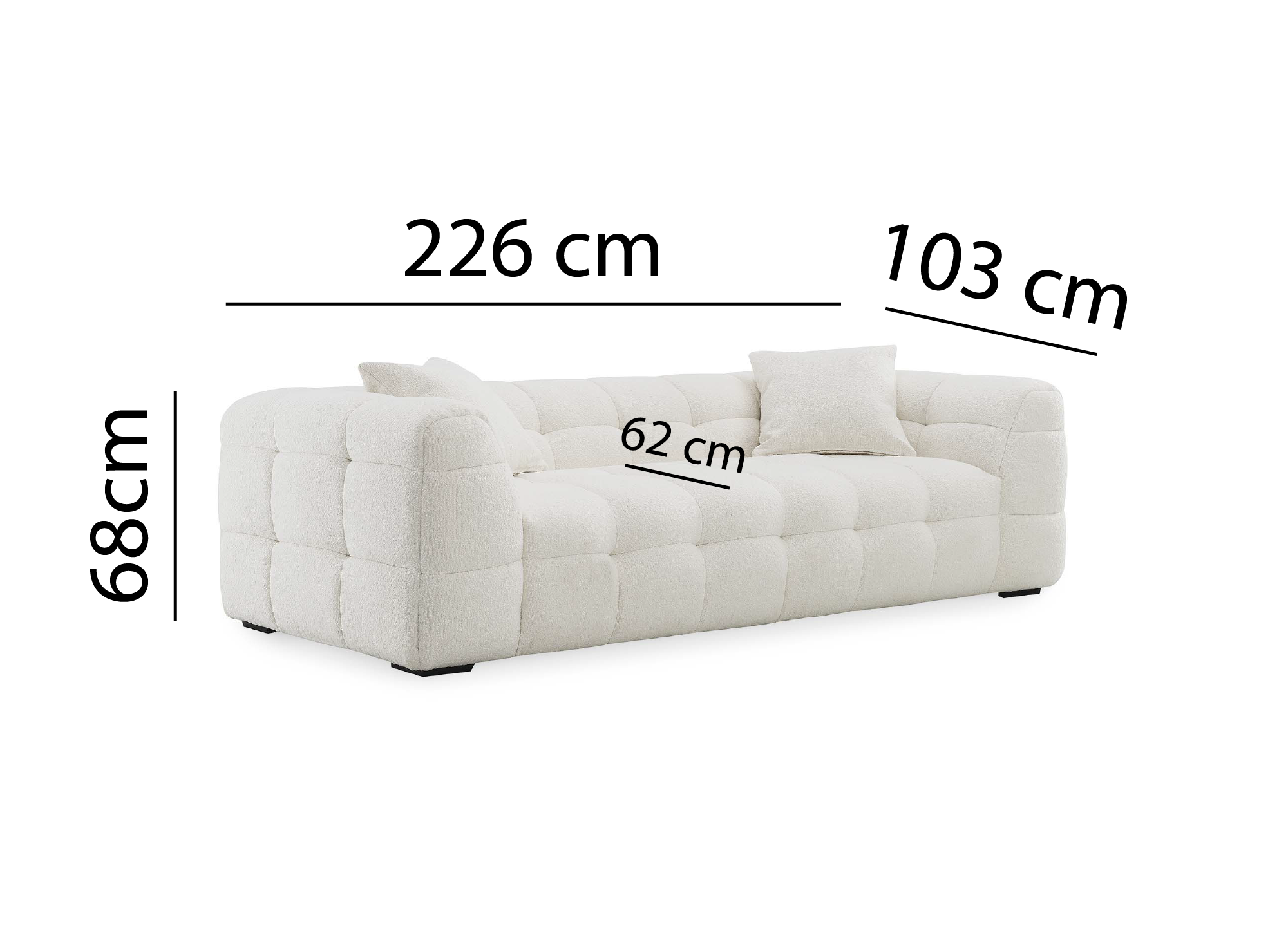 Dimensions : Largeur 226 cm x Profondeur 103 cm x Hauteur 70 cm / Hauteur d'assise : 42 cm / Hauteur pieds : 3 cm