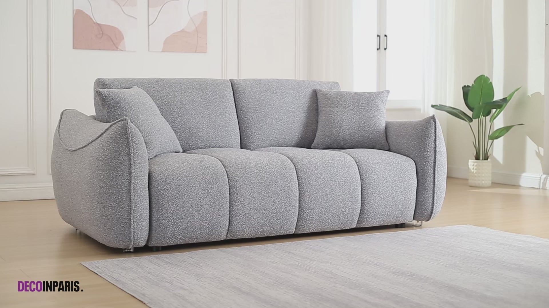 Revêtu d’un tissu effet bouclette, le canapé EZRA offre une texture douce et agréable au toucher, parfaite pour vos moments de détente. Son dossier généreusement rembourré, son assise à haute densité, et ses accoudoirs courbés sont pensés pour épouser les formes de votre corps et offrir un confort optimal.