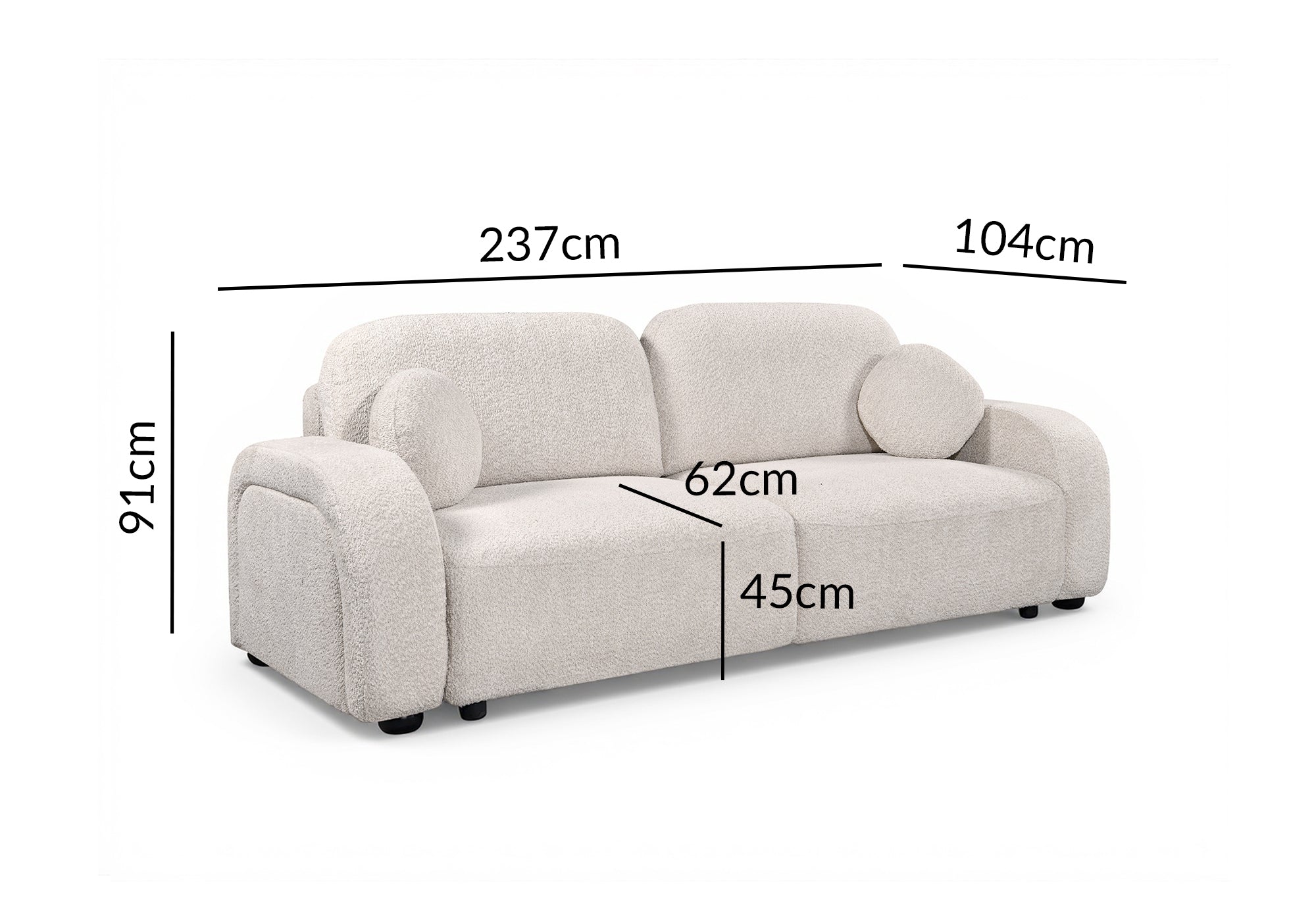 Le canapé MAYORA en tissu bouclette écru combine confort, praticité et gain de place dans un format compact. Conçu pour 3 places, il s’intègre facilement dans un salon, une chambre ou un studio, en offrant une assise agréable au quotidien et une solution de couchage pratique grâce à son mécanisme convertible simple et rapide.