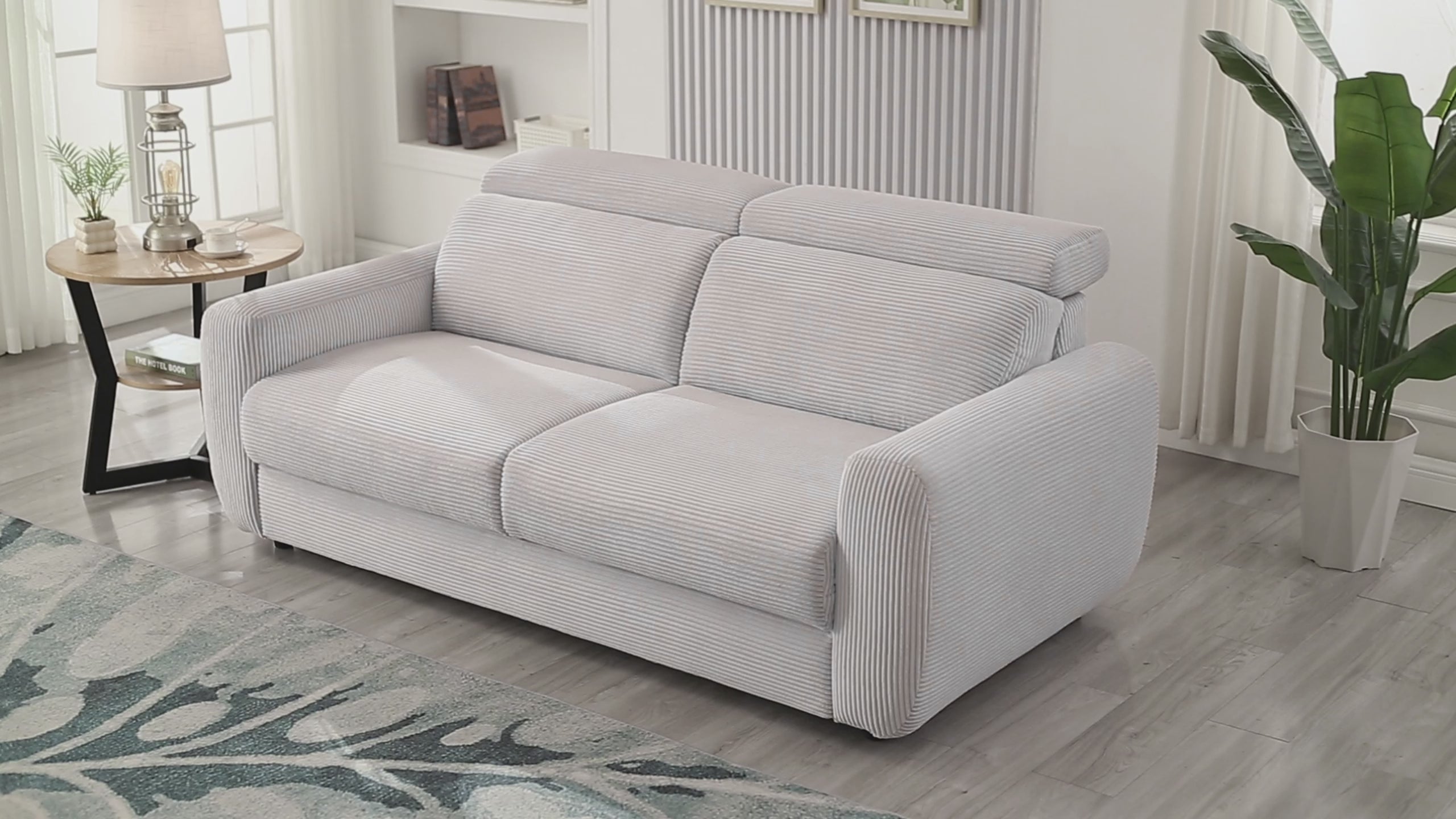Son revêtement en velours côtelé gris doux et chaleureux apporte une sensation cocooning tout en s’intégrant parfaitement dans une déco contemporaine ou plus classique. Les tétières relevables offrent un maintien optimal pour la tête et la nuque, que ce soit pour lire, regarder la télévision ou simplement se détendre.