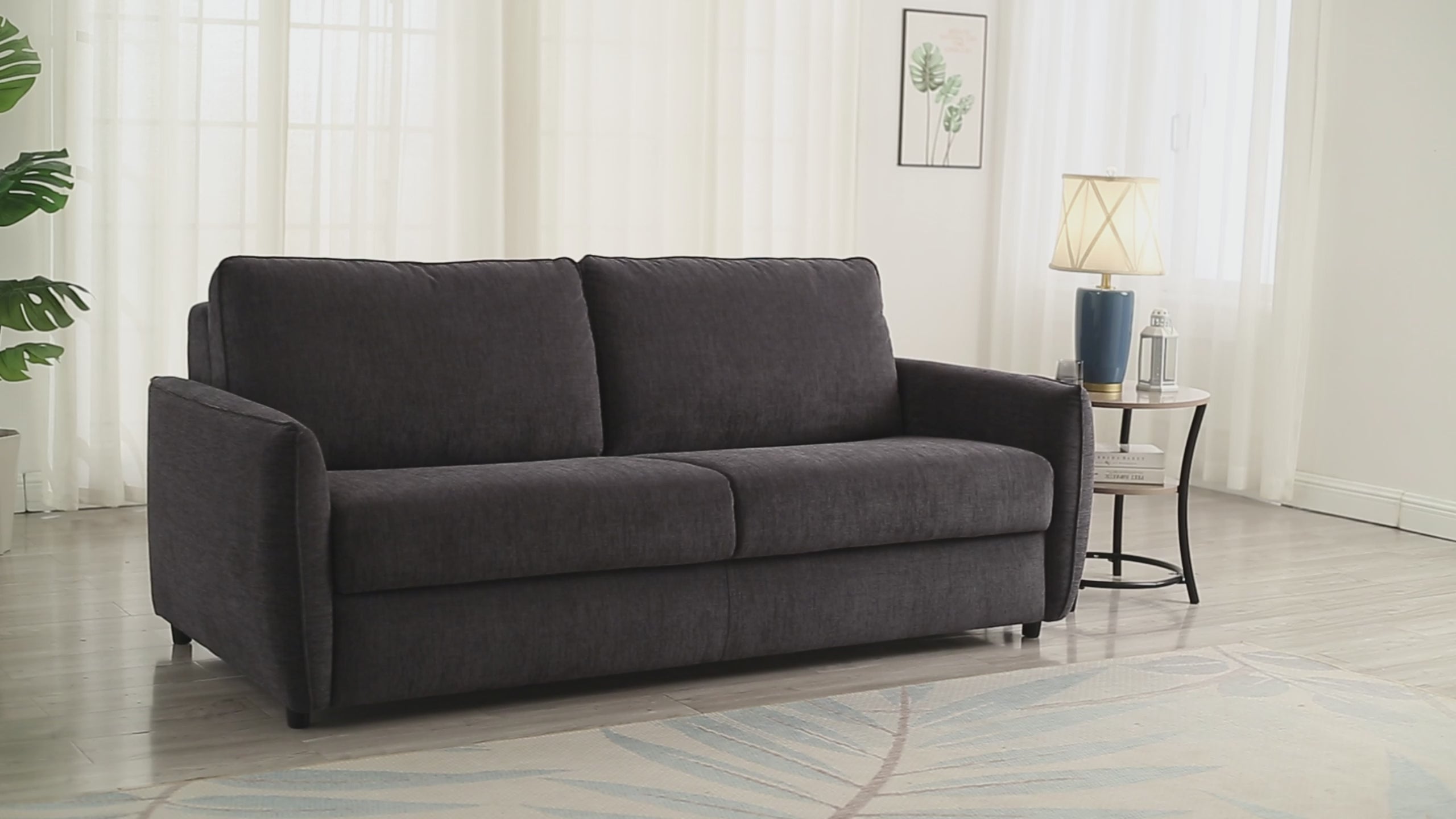 Le canapé-lit CHIARA allie sobriété, confort et praticité dans un format parfaitement adapté à la vie moderne. Avec ses lignes épurées, son assise accueillante et son revêtement en velours texturé gris foncé, il s’intègre facilement dans tous les styles d’intérieur du plus contemporain au plus classique.