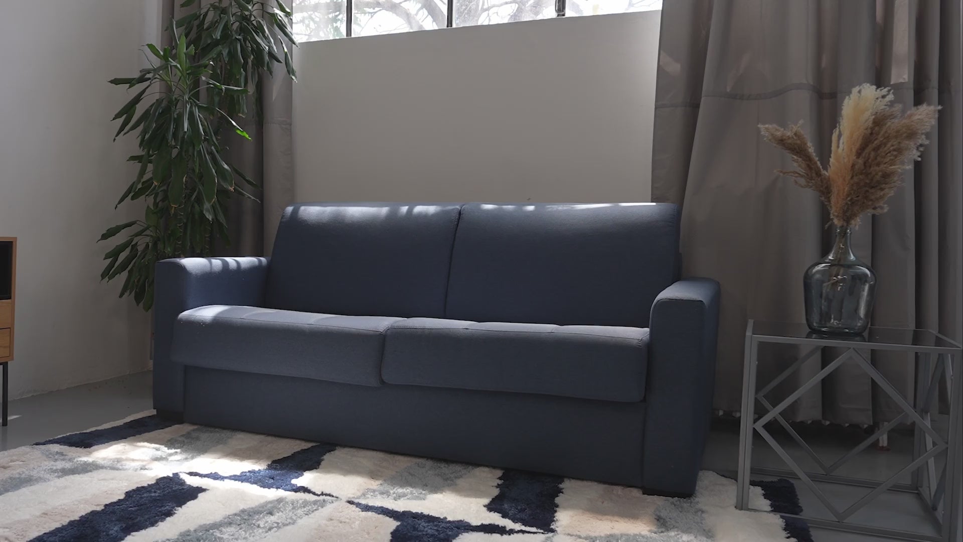 Canapé convertible 3 places LOUNA en tissu bleu denim ouverture express