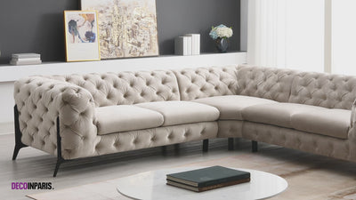 Découvrez notre canapé d'angle en velours beige CARMEN et l’alliage parfait du style mythique et indémodable so british !