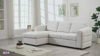 Transformez votre salon avec le canapé d'angle convertible CALANDRA, alliant parfaitement design moderne, confort et fonctionnalité. Avec son revêtement en tissu bouclette gris clair doux et élégant, ce canapé apporte une touche chaleureuse et contemporaine à votre espace de vie.