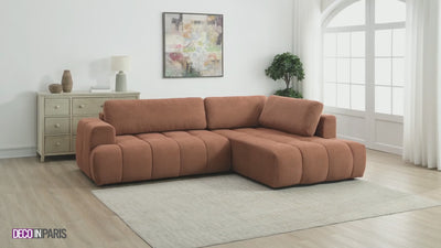 Le canapé d'angle convertible avec coffre de rangement en tissu terracotta HAVEN apportera une touche de confort et d’élégance à votre salon. Son design épuré et ses assises larges et moelleuses offrent une expérience de détente unique tout en sublimant votre intérieur.