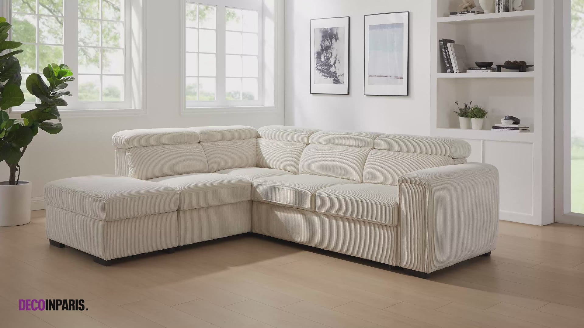Offrez élégance et praticité à votre salon avec le canapé d'angle gauche convertible 5 places en velours côtelé épais beige avec pouf coffre ZENOVA.