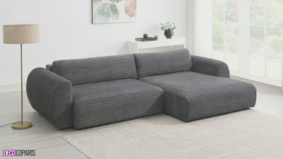 Découvrez le canapé d'angle convertible avec coffre 3 places en velours côtelé épais gris TILDA, une pièce maîtresse qui marie élégance et fonctionnalité pour sublimer votre intérieur.