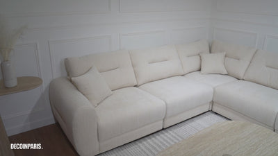 Grâce à sa forme d’angle généreuse, il offre un vaste espace pour se relaxer, accueillir famille et amis ou simplement profiter d’un moment de calme. Son assise moelleuse et ses dossiers légèrement capitonnés assurent un confort optimal, tandis que ses lignes arrondies et ses accoudoirs épais soulignent son allure contemporaine et accueillante.
