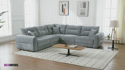 Grâce à sa forme d’angle généreuse, il offre un vaste espace pour se relaxer, accueillir famille et amis ou simplement profiter d’un moment de calme. Son assise moelleuse et ses dossiers légèrement capitonnés assurent un confort optimal, tandis que ses lignes arrondies et ses accoudoirs épais soulignent son allure contemporaine et accueillante.