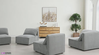 Chaque détail du canapé d'angle modulable a été pensé pour offrir une expérience de détente. Les accoudoirs légèrement arrondis et la profondeur généreuse de l'assise vous invitent à vous installer confortablement et à profiter de moments de convivialité. Que ce soit pour recevoir des amis, profiter d'une soirée cinéma en famille ou tout simplement vous reposer après une longue journée, ce canapé répondra à toutes vos attentes.
