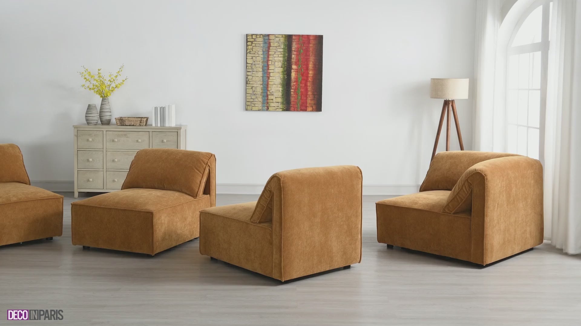 Créez votre espace salon sur mesure avec ce grand canapé d'angle modulable et réversible en velours couleur moutarde HARINA. Sa conception réversible s'adaptera facilement à votre intérieur, que vous souhatiez un angle à gauche ou à droite.