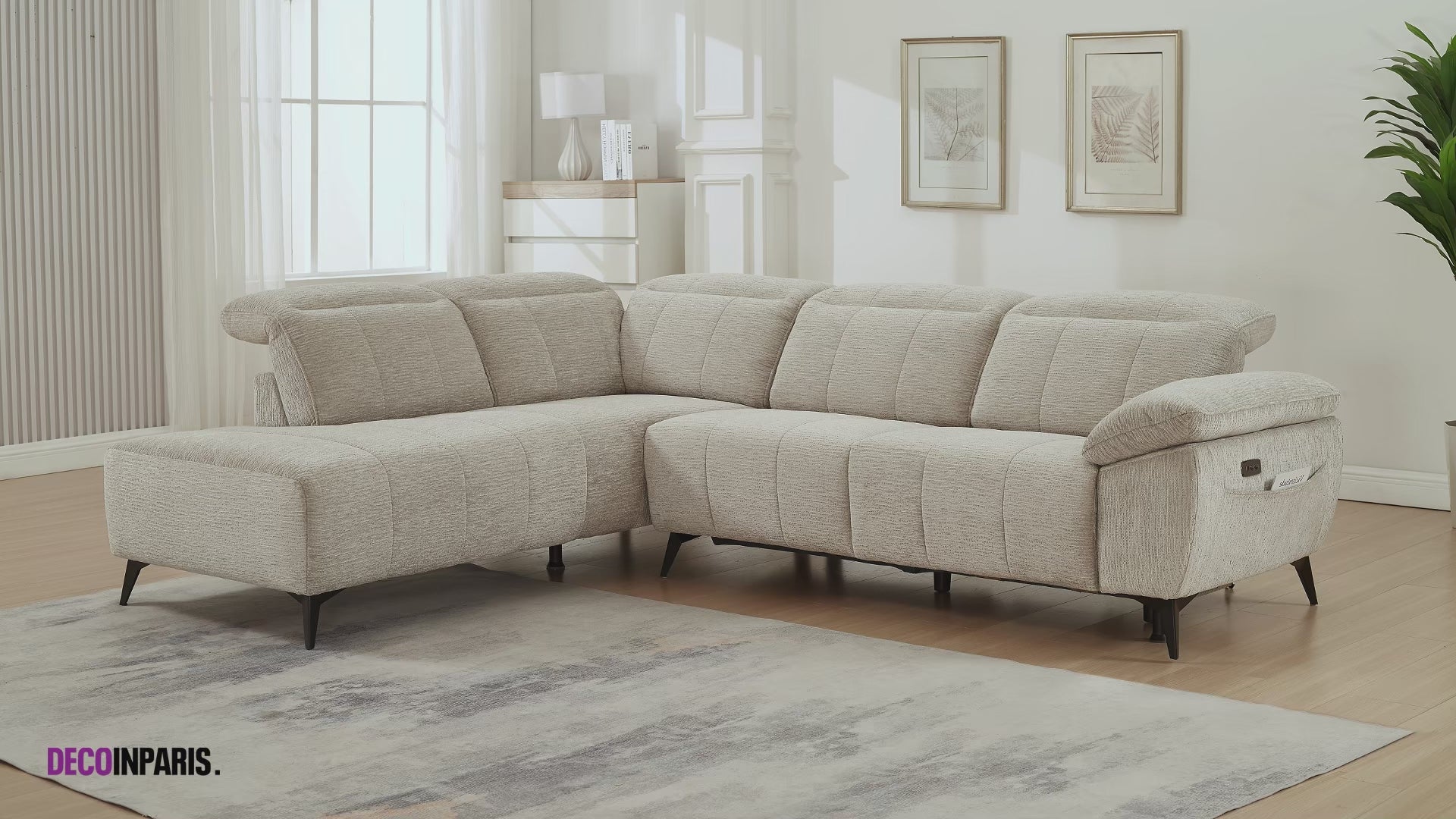 Avec son allure moderne et son confort haut de gamme, le canapé d’angle relax électrique SOLINA en velours chiné beige est une invitation à la détente. Parfait pour les salons spacieux, il allie esthétique raffinée et fonctionnalités bien pensées pour un usage quotidien.