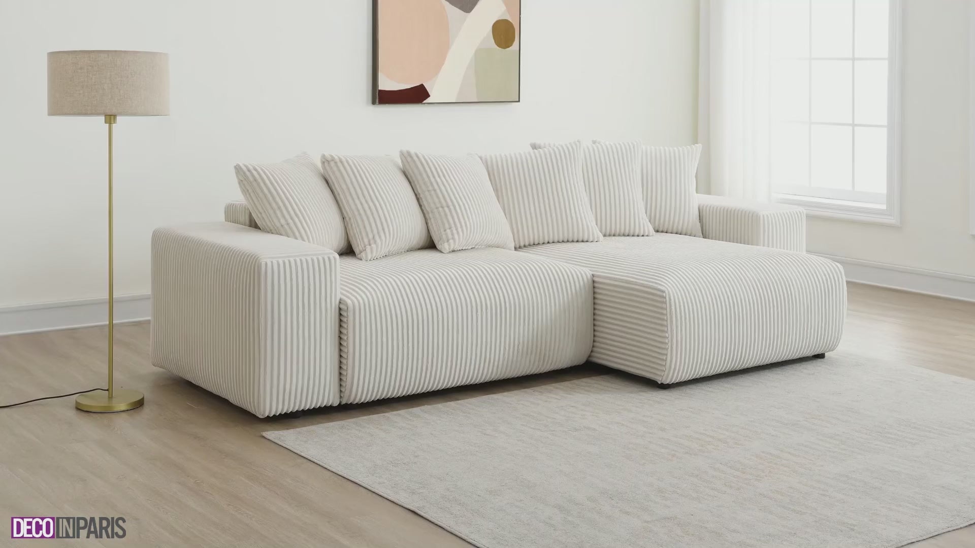 Découvrez notre canapé d’angle convertible et réversible avec coffre de rangement en velours côtelé épais beige NOELIA.
