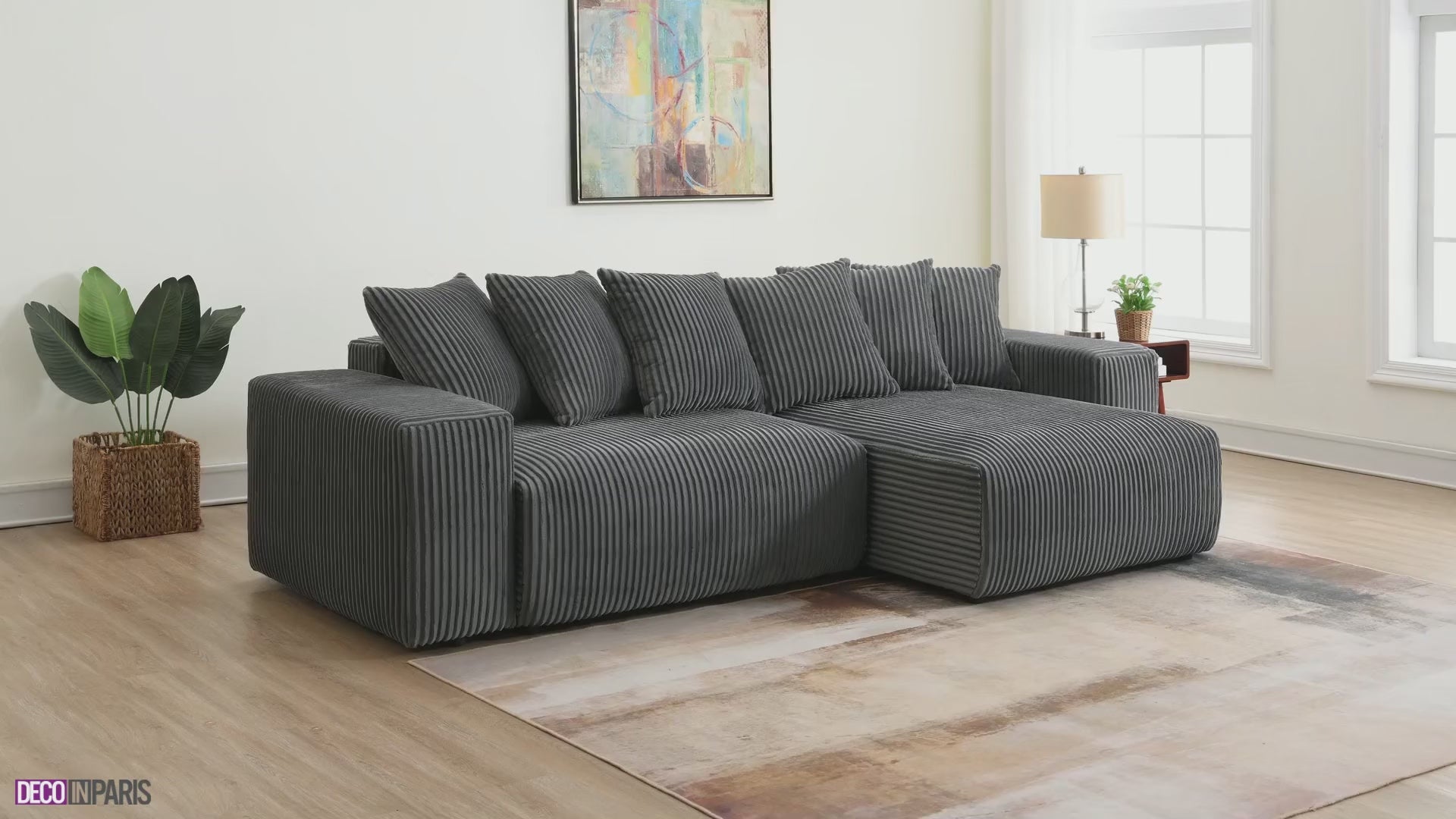 Découvrez notre canapé d’angle convertible et réversible avec coffre de rangement en velours côtelé épais gris NOELIA.