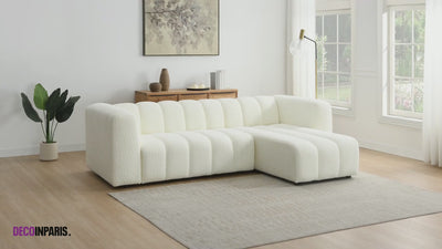 Transformez votre espace de vie avec le canapé d'angle réversible en tissu bouclette écru AELIS, un canapé design à la fois élégant, fonctionnel et ultra confortable. Idéal pour les salons contemporains, scandinaves ou minimalistes, ce canapé d’angle réversible en tissu bouclette incarne le parfait équilibre entre esthétique raffinée et confort quotidien.