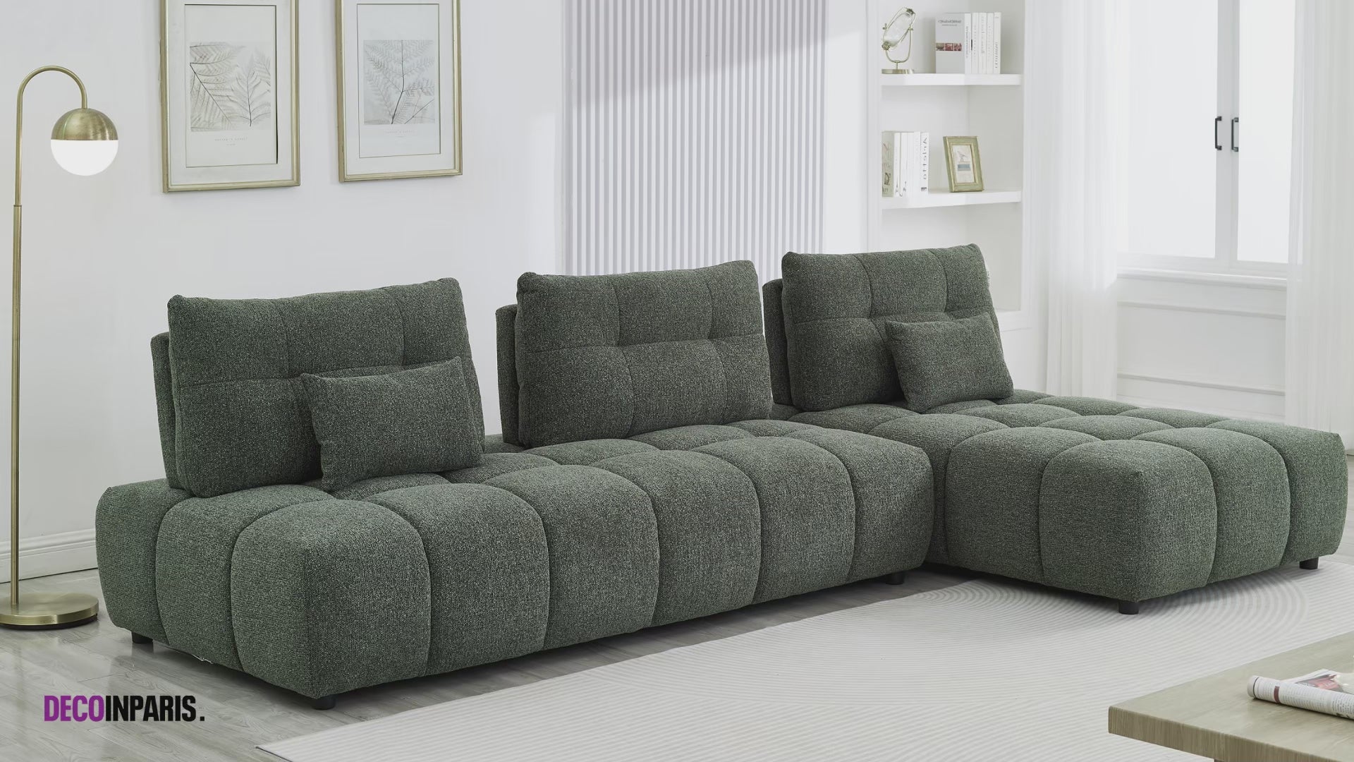 Le canapé d'angle réversible avec dossier ajustable en velours chiné vert kaki ALANA allie style et confort absolu. Avec son design généreusement capitonné et ses dimensions spacieuses, il s’intègre parfaitement dans les salons modernes et raffinés.