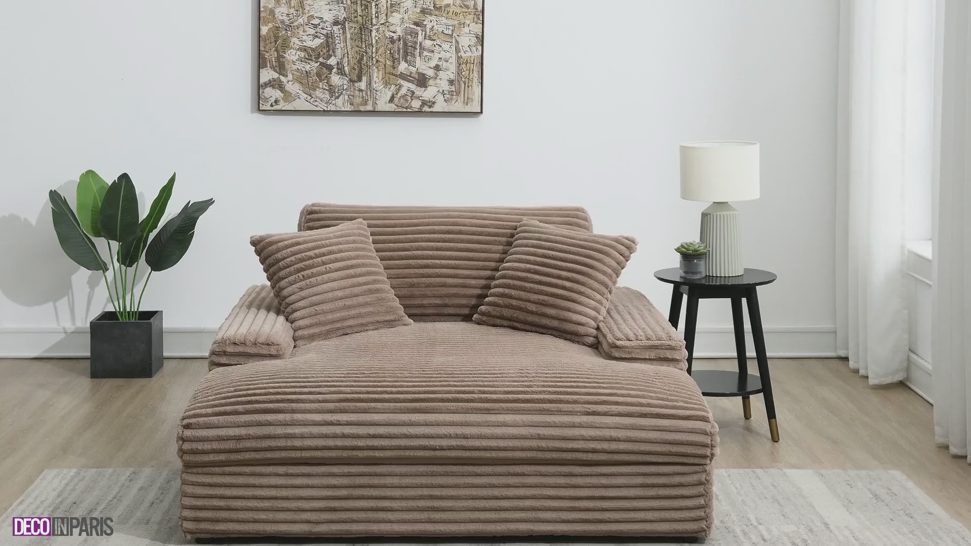 Découvrez le canapé méridienne en gros côtelé marron taupe doux DAHO, parfaite pour les petits espaces.