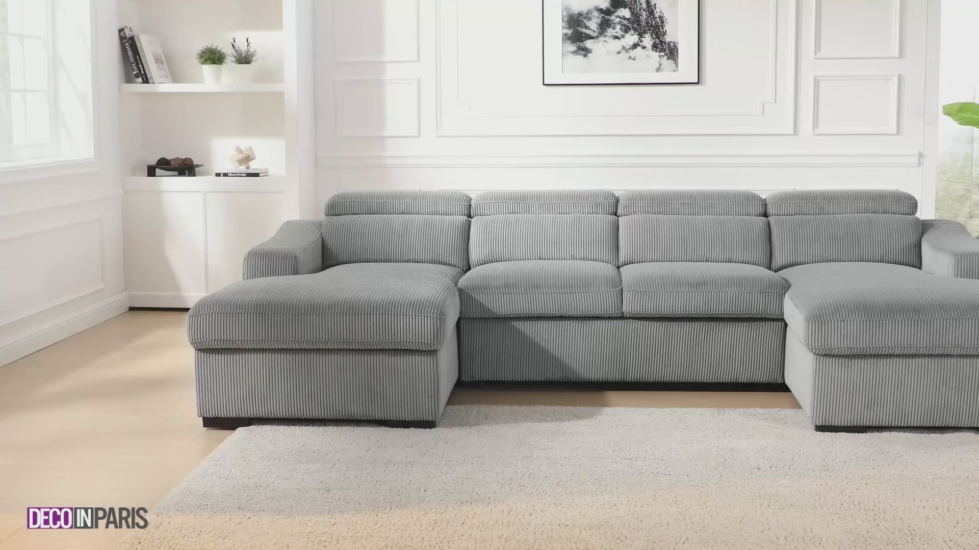 Découvrez l’élégance et la praticité réunies dans le canapé panoramique en U convertible avec coffre en velours côtelé épais gris VELORA.