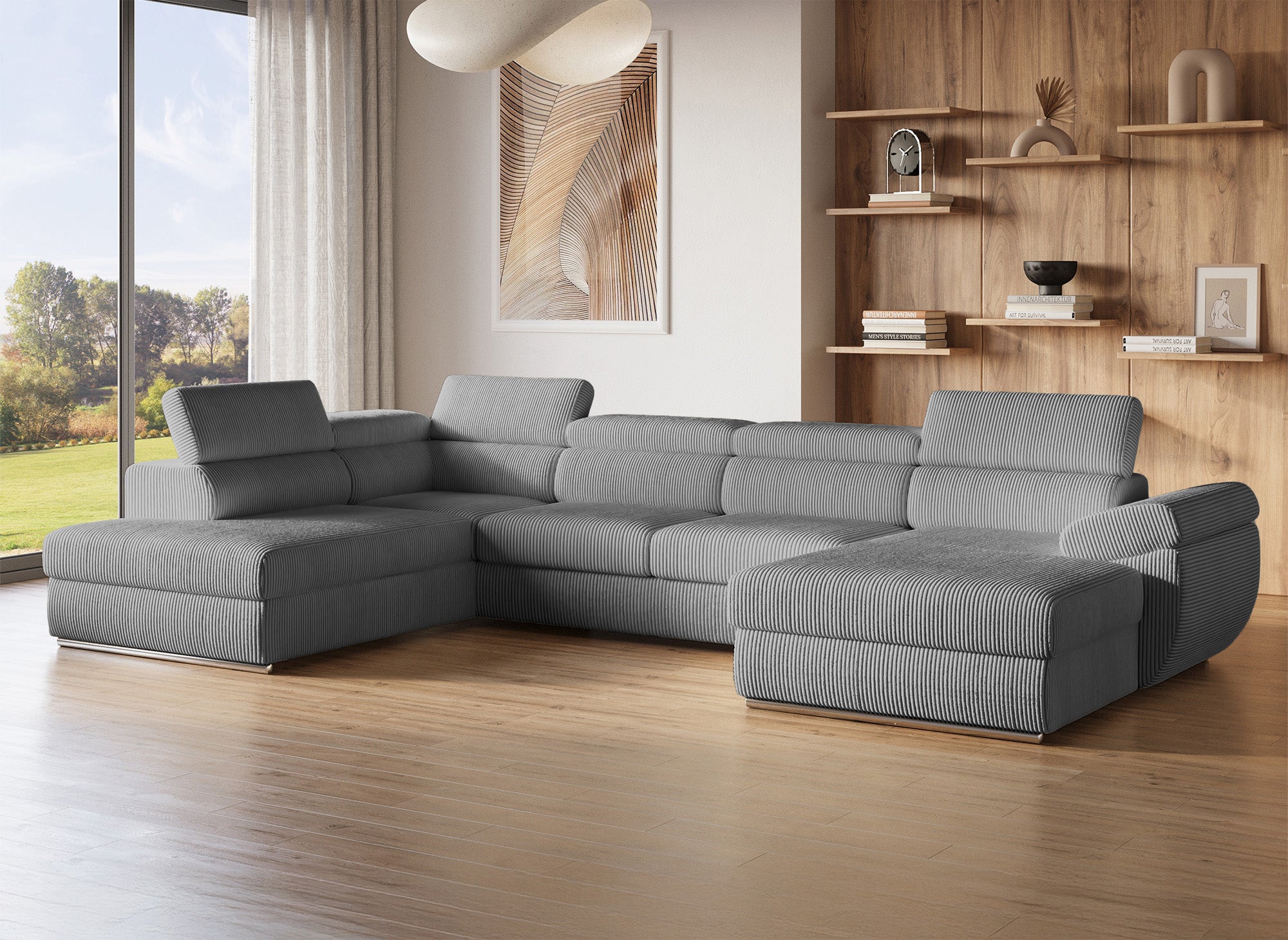 Canapé panoramique convertible avec coffre en velours côtelé épais gris MARIANO- Angle droit