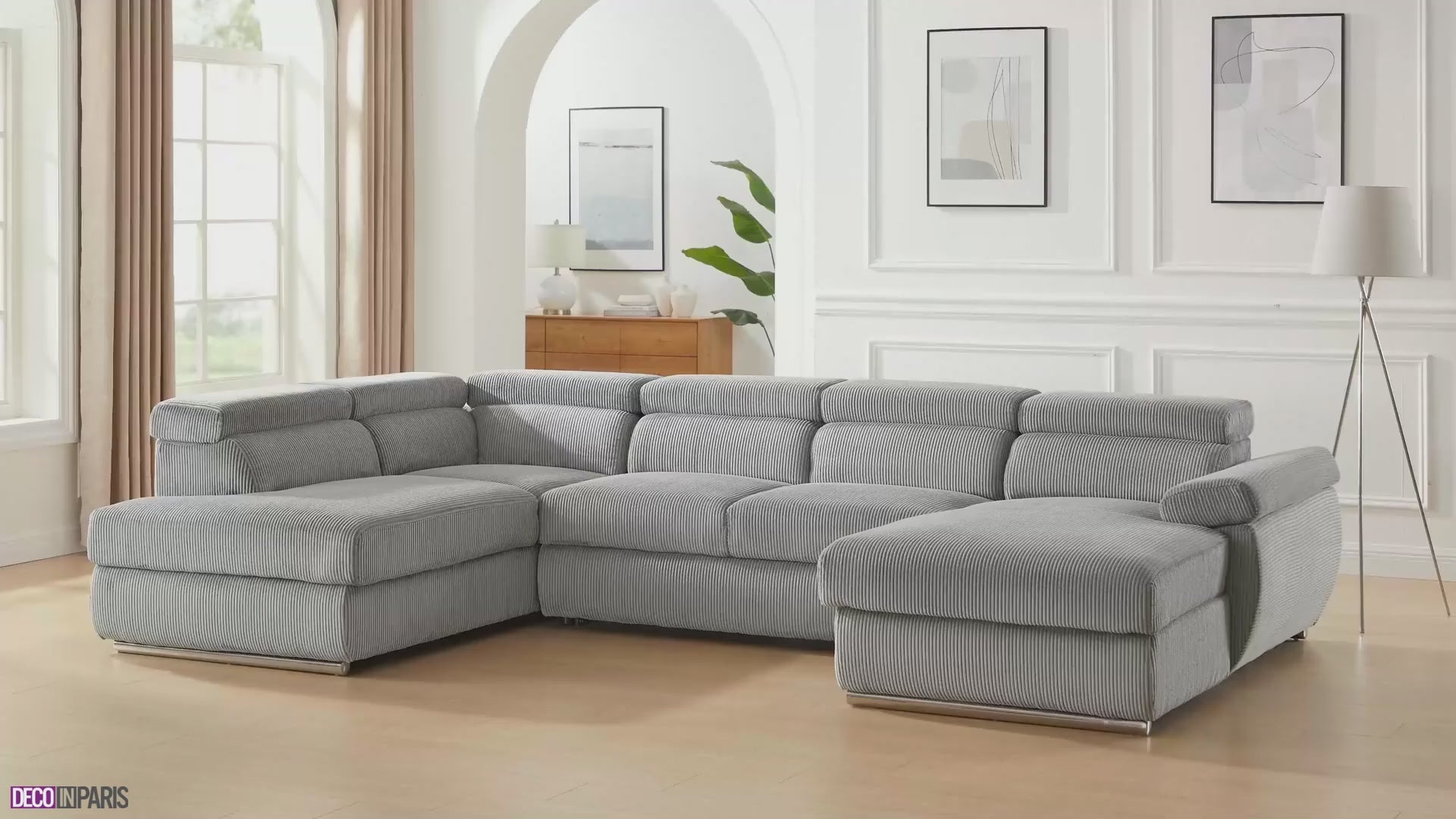 Grâce à son look élégant, le canapé d’angle convertible MARIANO saura s’adapter à tous les intérieurs. Son allure résolument contemporaine, s'associera à son revêtement tendance en velours côtelé épais , pour une pièce de vie haute en douceur. Ses généreuses courbes arrondies ainsi que la finesse de son piètement en métal chromé argenté, apporteront une note de charme et d’authenticité à votre salon.