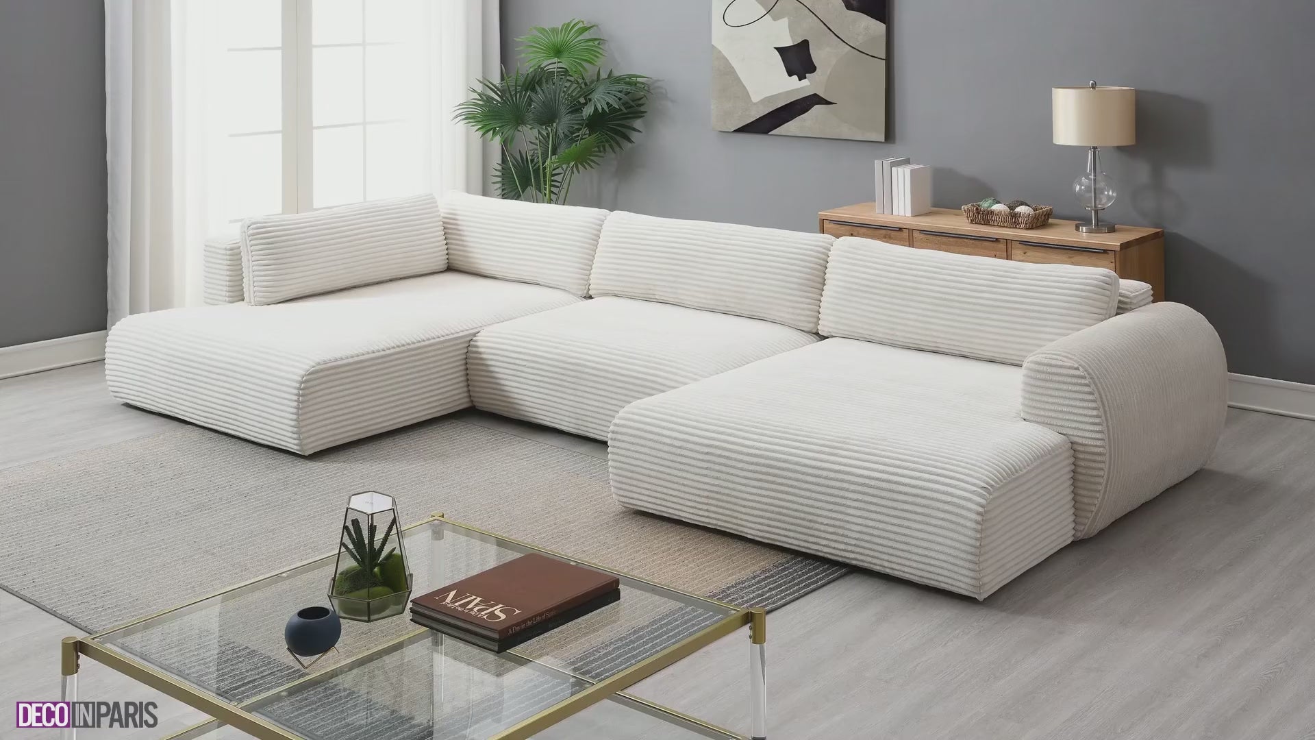 Le canapé panoramique convertible TILDA en velours gros côtelé beige est la solution parfaite pour créer un intérieur à la fois cosy et élégant, alliant confort, style et fonctionnalité.