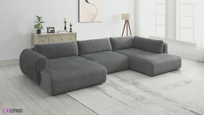 Le canapé panoramique convertible TILDA en velours gros côtelé gris est la solution parfaite pour créer un intérieur à la fois cosy et élégant, alliant confort, style et fonctionnalité.