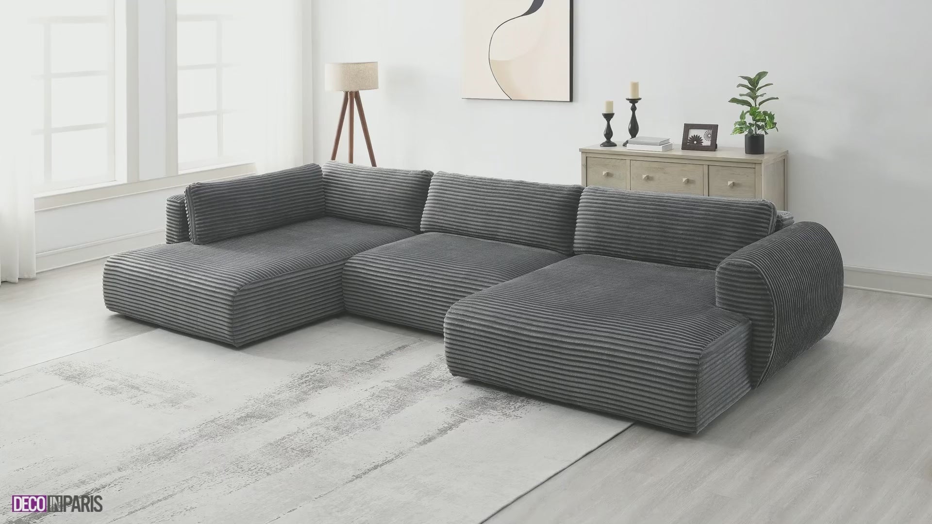 Canapé panoramique convertible avec coffre en velours gros côtelé gris TILDA - Angle gauche - DécoInParis