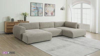 Envie de donner à votre intérieur un côté cosy mais tout aussi élégant ? Craquez pour le canapé panoramique convertible avec coffre de rangement en velours gros côtelé taupe TILDA.