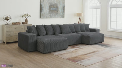 Découvrez notre canapé panoramique convertible avec coffre de rangement en velours côtelé épais gris NOELIA.