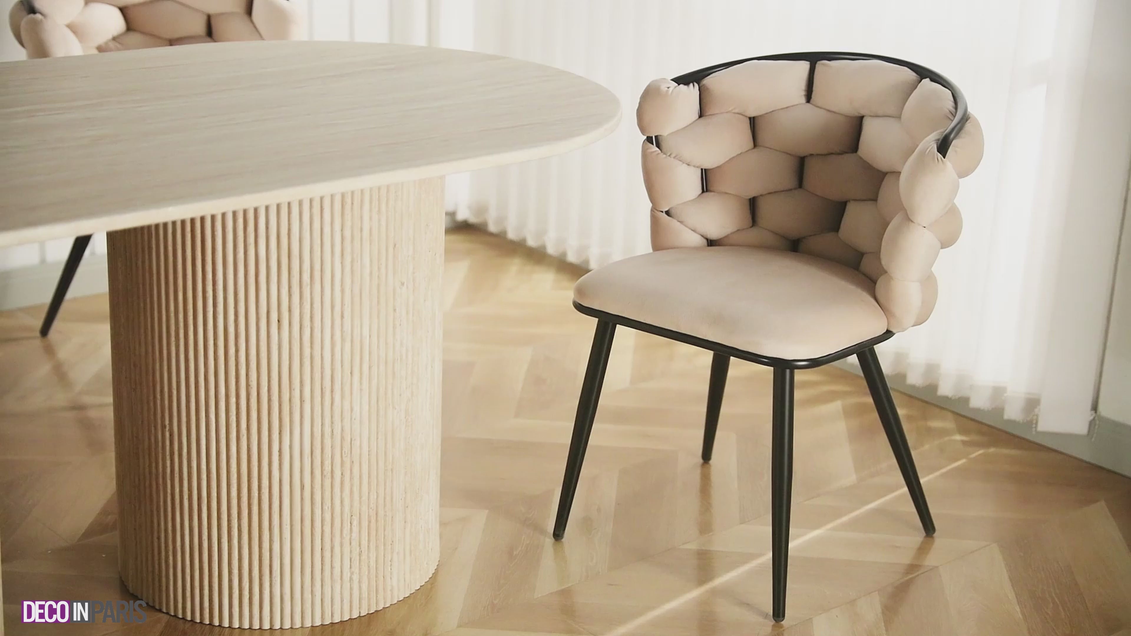 Son revêtement en velours, tressé de façon originale, a été utilisé pour offrir à la chaise un côté apaisant et un toucher doux. Les différents coloris, aux couleurs tendances, apporteront une note de chaleur à votre pièce.