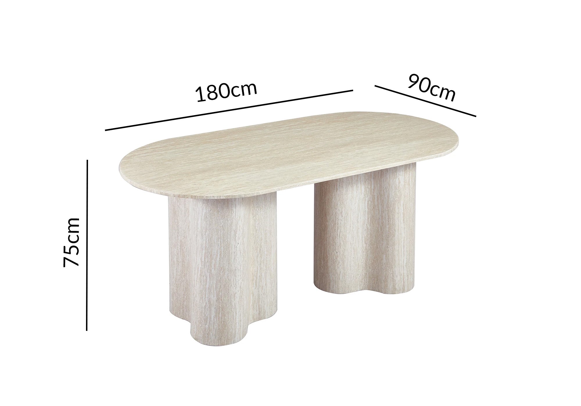 Son plateau ovale en marbre composite effet travertin offre une surface lumineuse et raffinée, idéale pour apporter une ambiance douce et naturelle à votre salle à manger.