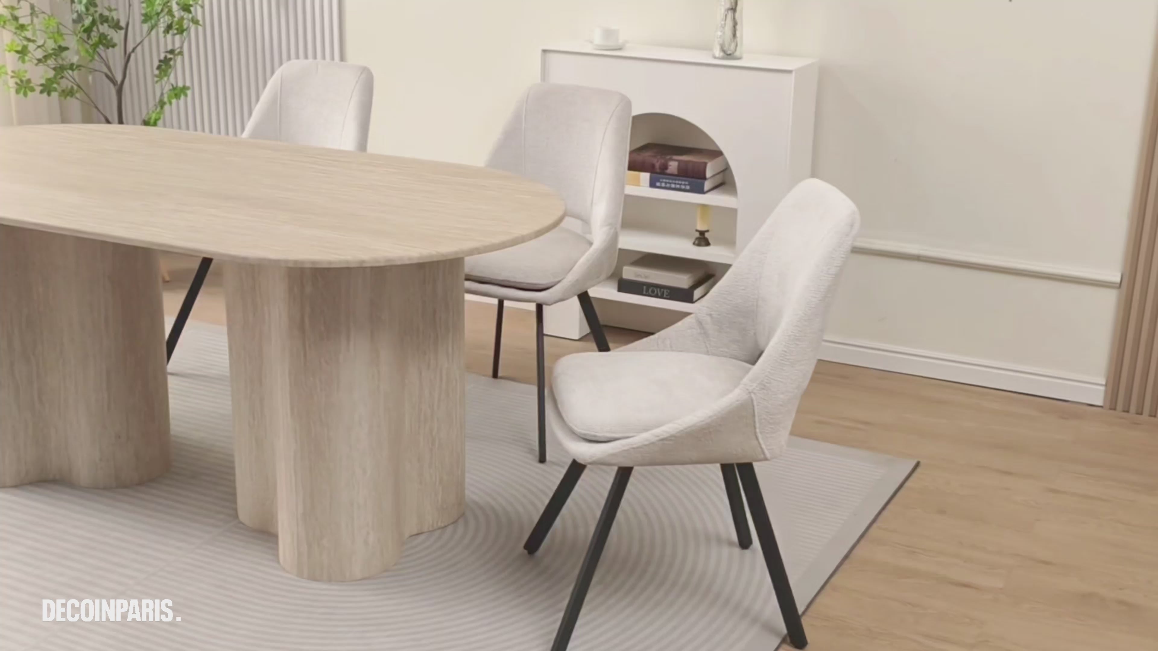 Associez la table VANINA à des chaises en tissu clair en tissu bouclette pour accentuer son caractère et créer un espace repas convivial et élégant.