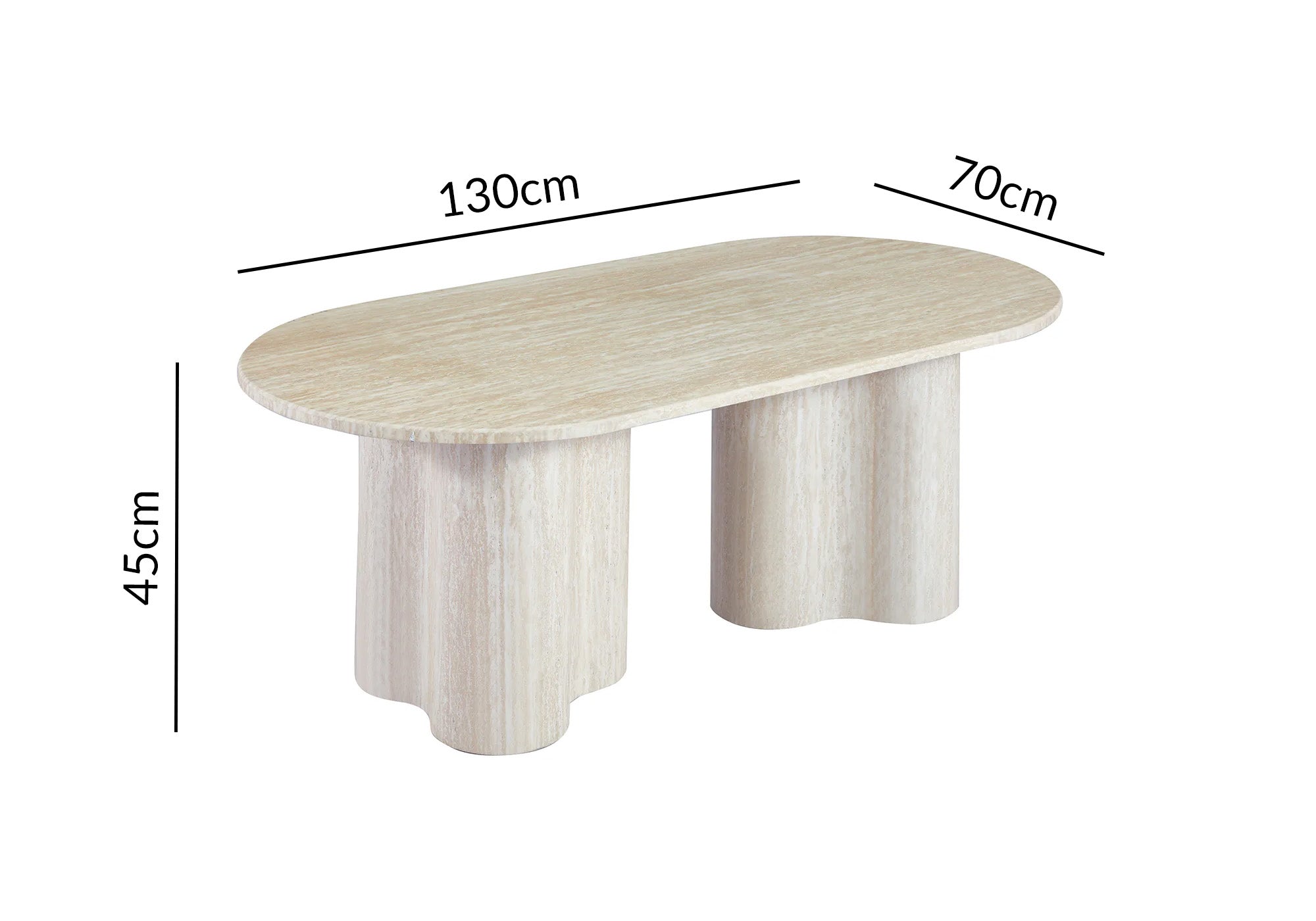 Son plateau ovale en marbre composite effet travertin offre une surface lumineuse et raffinée, idéale pour créer une ambiance chaleureuse et accueillante dans votre espace de vie.